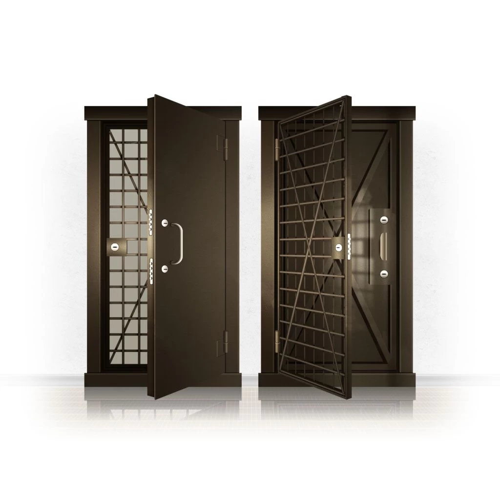 Металлические двери КХО и КХН представляют собой входные блоки, обладающие высоким уровнем взломостойкости и состоят из трех основных элементов: усиленного каркаса, сплошного металлического полотна и решетчатой двери. Дверной блок изготавливается из стального уголка 100*100 мм. Места крепления блока к стене цементируются и закрываются стальными наличниками шириной 40 мм. Крепеж заходит вглубь стены на 80 мм. В конструкции внешней створки монтируются ребра жесткости, для обшивки используется сталь толщиной не менее 3 мм. Внутренняя решетка изготавливается из прутка диаметром 16 мм. Размер ячеек решетки должен составлять не более 15 на 15 см. В точках пересечения прутья надежно приваривают друг к другу. В КХО и КХН необходимо поддерживать определенную температуру и влажность. Для этого внутреннее пространство глухой двери заполняется теплоизоляционным материалом, а по периметру двери приклеивается уплотнитель. Такие двери оборудуются замками с повышенным уровнем взломостойкости. Специализированные двери КХО и КХН в Отрадном могут быть оснащены сигнализацией, в конструкции могут быть проушины для навесного замка и элементами для опечатывания. Если идет речь о двери в комнату хранения оружия, в створке оборудуется окно для выдачи оружия и спец. средств, которое накрывается стальной дверцей.