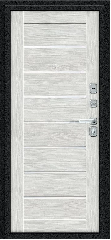Надежная входная Дверь Браво Техно/BChrome Букле черное/Bianco Melinga премиум класса по цене 34 135 руб. Большая толщина стали защитит от проникновения в ваш дом, квартиру или коттедж. Используется очень качественная фурнитура: замки, цилиндры, ручки, защелки. Покрытие и отделка двери изготовлено под внимательным контролем производителя. Дверь имеет долгий срок службы и гарантию.