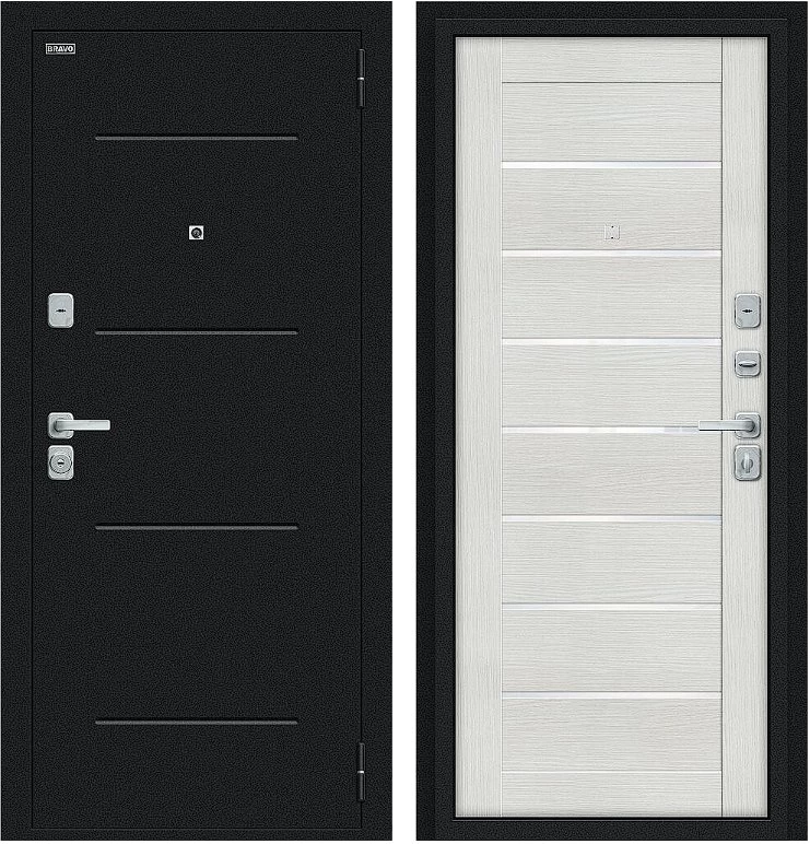 Надежная входная Дверь Браво Техно/BChrome Букле черное/Bianco Melinga премиум класса по цене 32 835 руб. Большая толщина стали защитит от проникновения в ваш дом, квартиру или коттедж. Используется очень качественная фурнитура: замки, цилиндры, ручки, защелки. Покрытие и отделка двери изготовлено под внимательным контролем производителя. Дверь имеет долгий срок службы и гарантию.